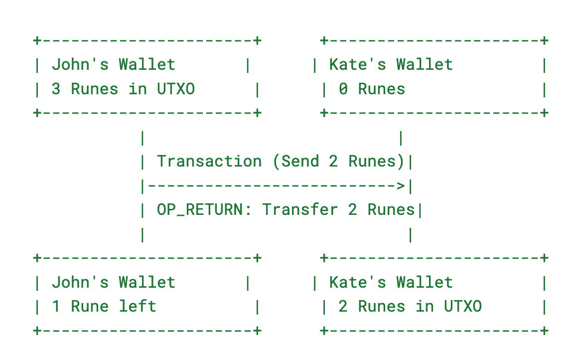 In the case of Bitcoin Runes, each UTXO can hold not just Bitcoin, but also different tokens or Runes. For example, let's say you have 2 Bitcoin Runes and want to transfer 1 Rune to a friend.